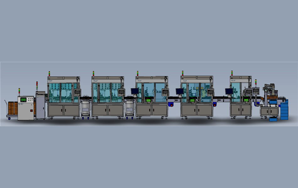 This production line can perform a series of automated operations for multi-well plates, including: storage in transfer carts → automatic feeding → automatic dust removal → automatic positioning → automatic filling → automatic visual inspection for foreign particles → automatic fill level detection → automatic silicone oil dispensing → automatic film sealing → CCD inspection of sealing effect → automatic marking & labeling → CCD code reading & label application inspection → automatic counting, discharge & buffering → automatic tray loading & boxing, and defective product rejection & buffering at each station.