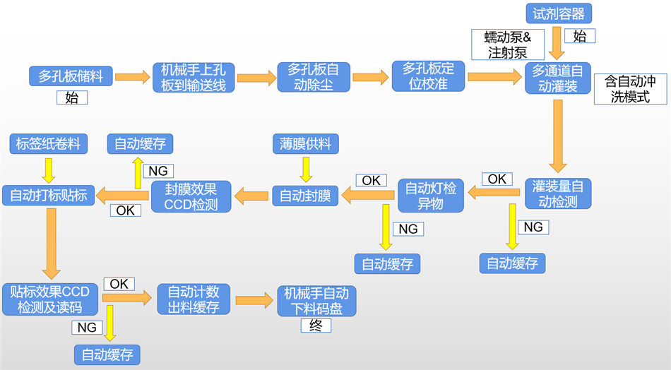 本產(chǎn)線可實(shí)現(xiàn)多孔板周轉(zhuǎn)車儲(chǔ)料—>自動(dòng)供料—>自動(dòng)吸塵—>自動(dòng)定位—>自動(dòng)灌裝—>自動(dòng)燈檢異物—>自動(dòng)檢測灌裝量—>自動(dòng)注矽油—>自動(dòng)封膜—>封膜效果CCD檢測—>自動(dòng)打標(biāo)貼標(biāo)—>CCD讀碼及貼標(biāo)效果檢測—>自動(dòng)計(jì)數(shù)出料緩存—>自動(dòng)碼盤裝箱及各工位不良品剔除緩存等一系列動(dòng)作,使該類產(chǎn)品的灌裝封膜貼標(biāo)工序?qū)崿F(xiàn)完全自動(dòng)化,提升產(chǎn)能及品質(zhì),節(jié)省人工。