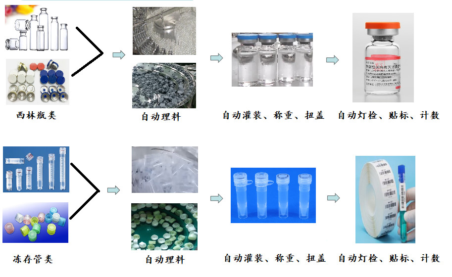 本產(chǎn)線可實現(xiàn)凍存管&西林瓶自動儲料—>自動理料供料—>CCD檢測瓶口—>自動空瓶稱重—>自動灌裝—>自動稱重—>自動供瓶蓋&膠塞—>瓶蓋良好性CCD檢測—>自動擰瓶蓋&加塞—>自動燈檢異物及空瓶—>CCD檢測擰蓋效果—>自動打標(biāo)貼標(biāo)—>貼標(biāo)效果CCD檢測—>自動出料收集或碼盤(托盤緩存及出料)等一系列動作,使該類產(chǎn)品的生產(chǎn)灌裝貼標(biāo)工序?qū)崿F(xiàn)完全自動化,提升產(chǎn)能及品質(zhì),節(jié)省人工。
